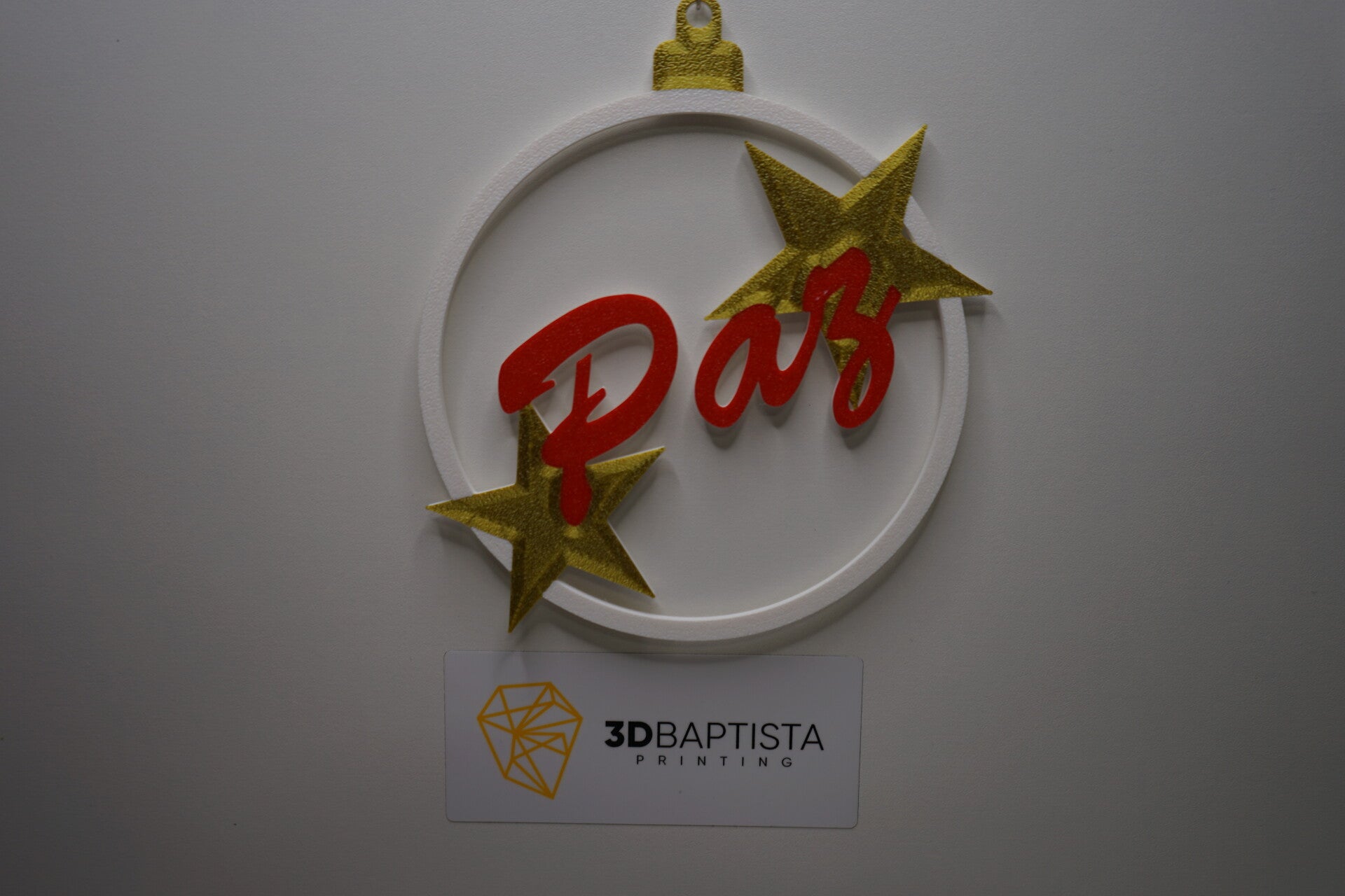 Diese Weihnachtskugel mit der Aufschrift "Paz" (portugiesisch für "Frieden") hat einen Durchmesser von 12,5 cm. Sie kombiniert eine weiße runde Rahmenstruktur mit roten Buchstaben und goldenen Sternen, was ihr eine elegante und festliche Ausstrahlung verleiht. Perfekt als Dekoration für den Weihnachtsbaum oder als symbolisches Geschenk für Frieden und Harmonie.