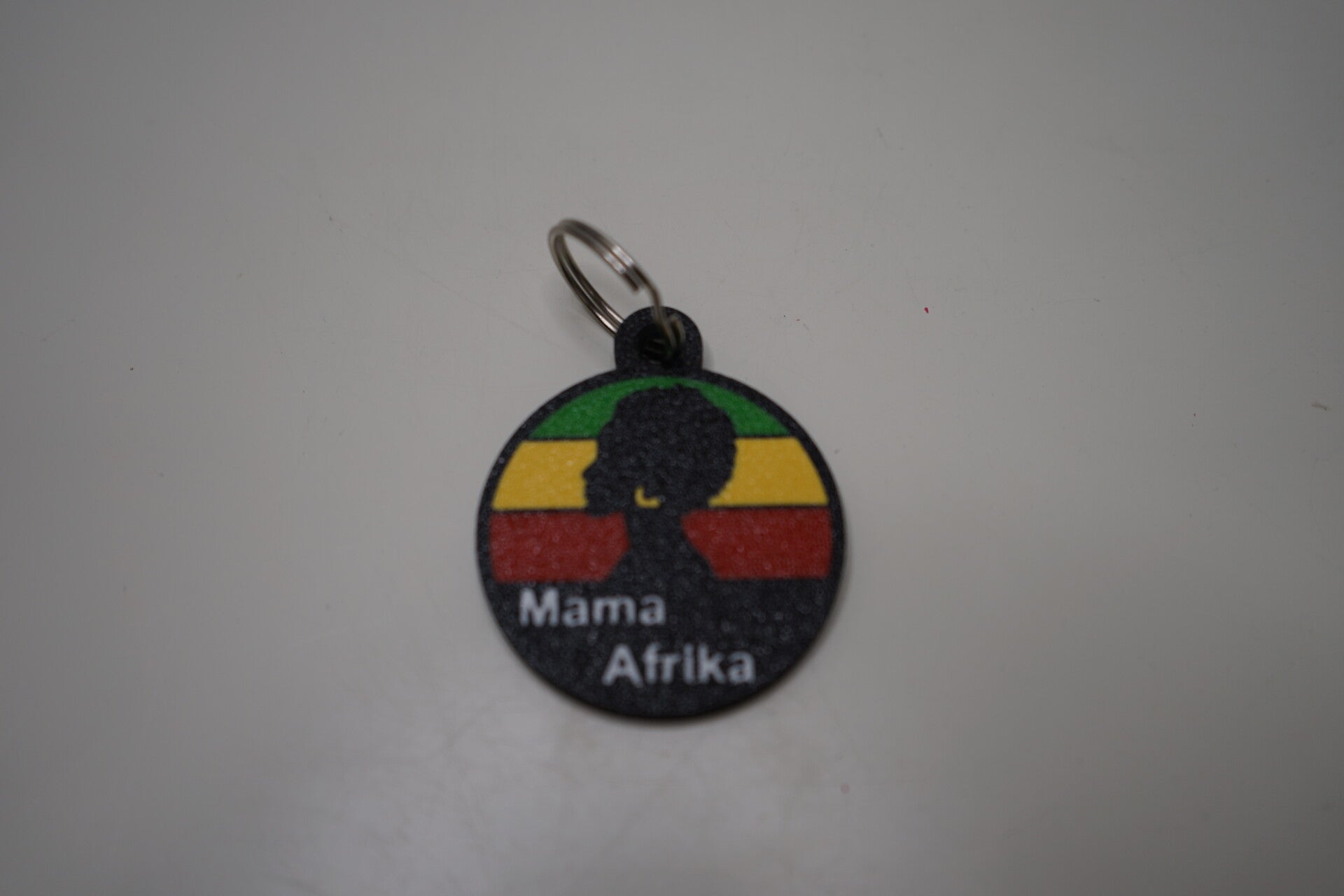 Dieser handgefertigte runde Schlüsselanhänger ist mehr als nur ein praktisches Accessoire – er ist ein Statement. Mit der stilvollen Silhouette einer afrikanischen Frau vor den Farben der panafrikanischen Flagge (Grün, Gelb, Rot) und dem Schriftzug "Mama Afrika", symbolisiert er Stolz, Herkunft und Verbundenheit mit dem afrikanischen Kontinent.