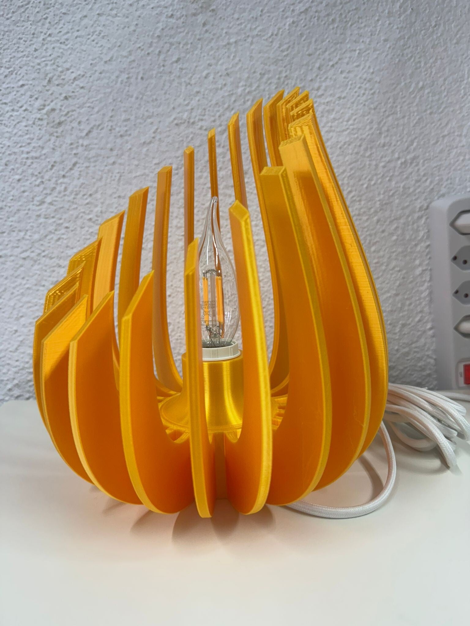 Diese moderne Tischlampe überzeugt durch ihr außergewöhnliches Design und schafft eine stilvolle Atmosphäre in jedem Raum. Der Lampenschirm besteht aus mehreren elegant angeordneten Lamellen, die zusammen eine harmonische, organische Form bilden und für ein besonders dekoratives Lichtspiel sorgen.