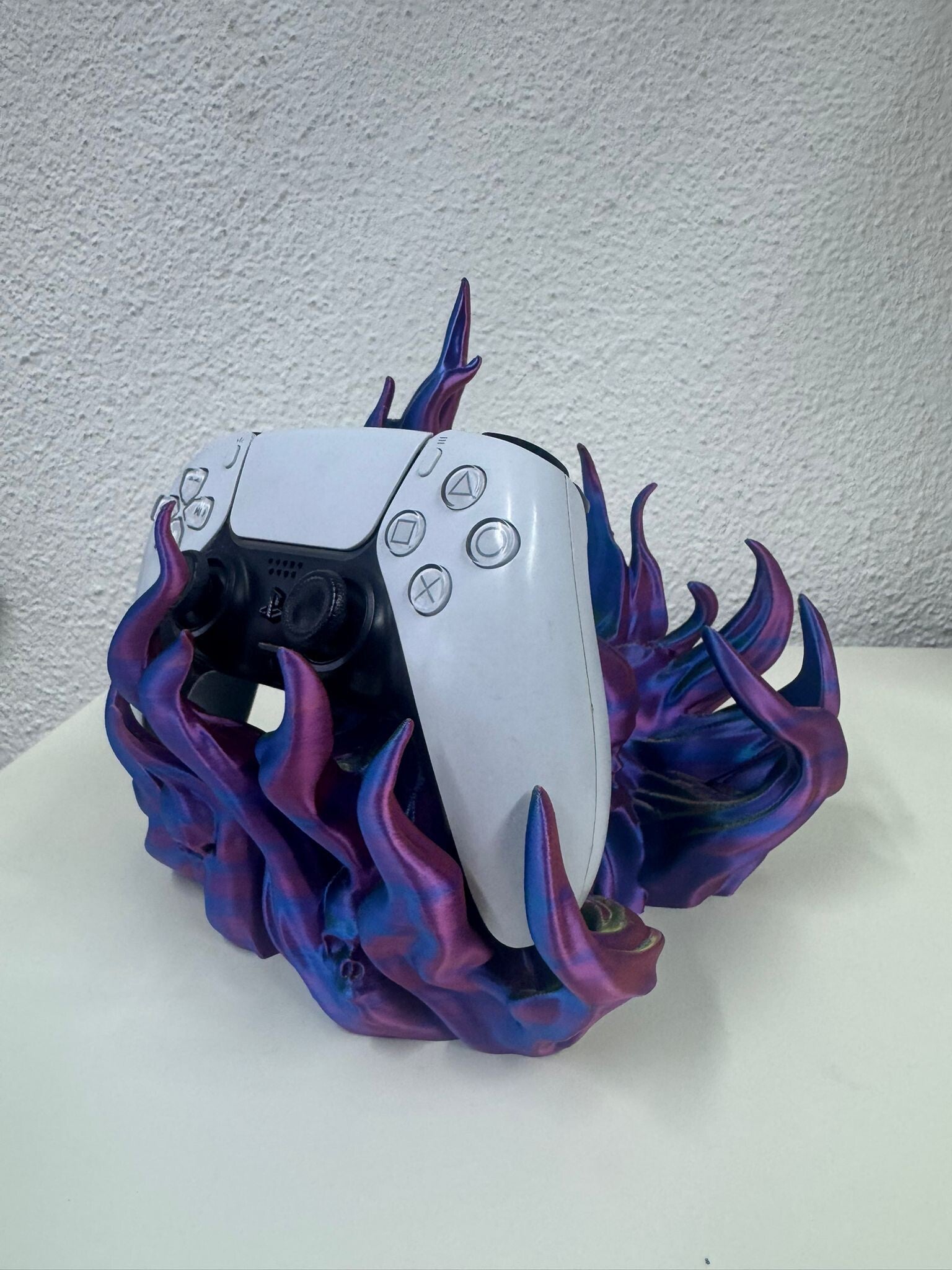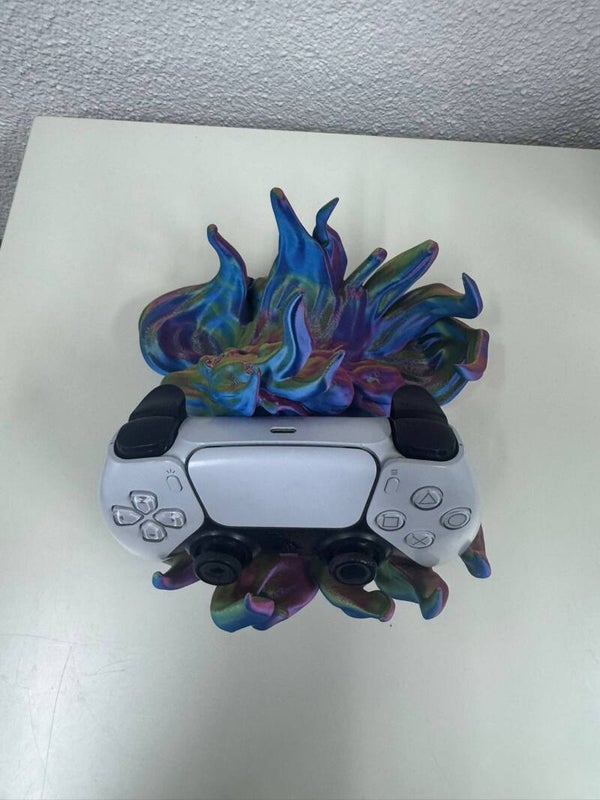 Diese außergewöhnliche Controller-Halterung für zwei Controller verbindet Funktionalität mit einem einzigartigen, modernen Design. Die kunstvolle, dynamische Form erinnert an fließende Wellen oder Flammen und macht die Halterung zu einem echten Blickfang in jedem Gaming-Setup.