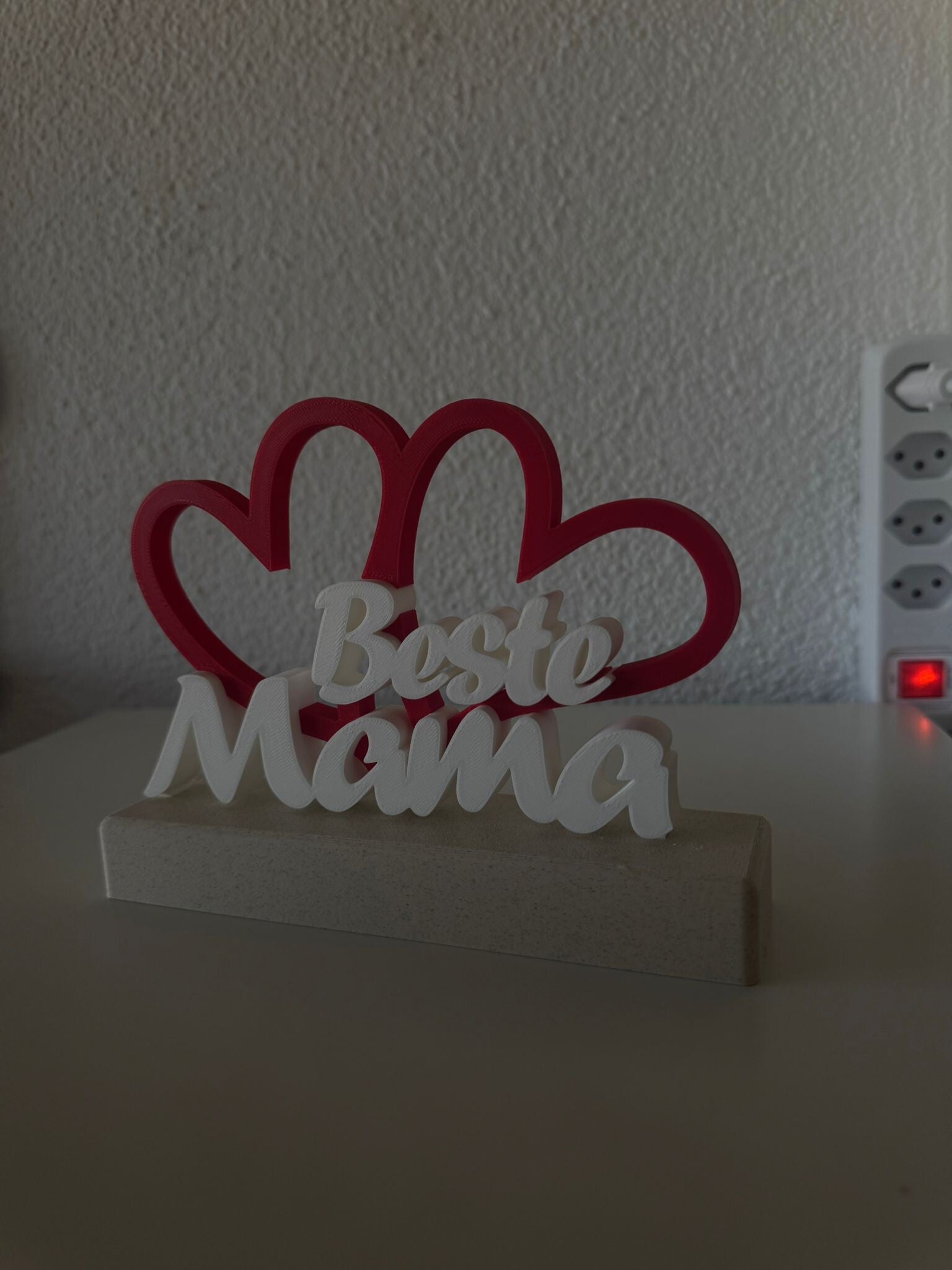 Dieses 3D-gedruckte Dekoobjekt zeigt drei miteinander verbundene Herzen mit dem Schriftzug „Beste Mama“. Es symbolisiert Liebe, Zusammenhalt und die besondere Verbindung innerhalb der Familie.
